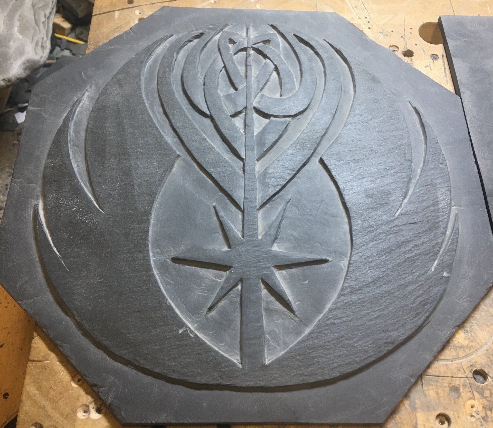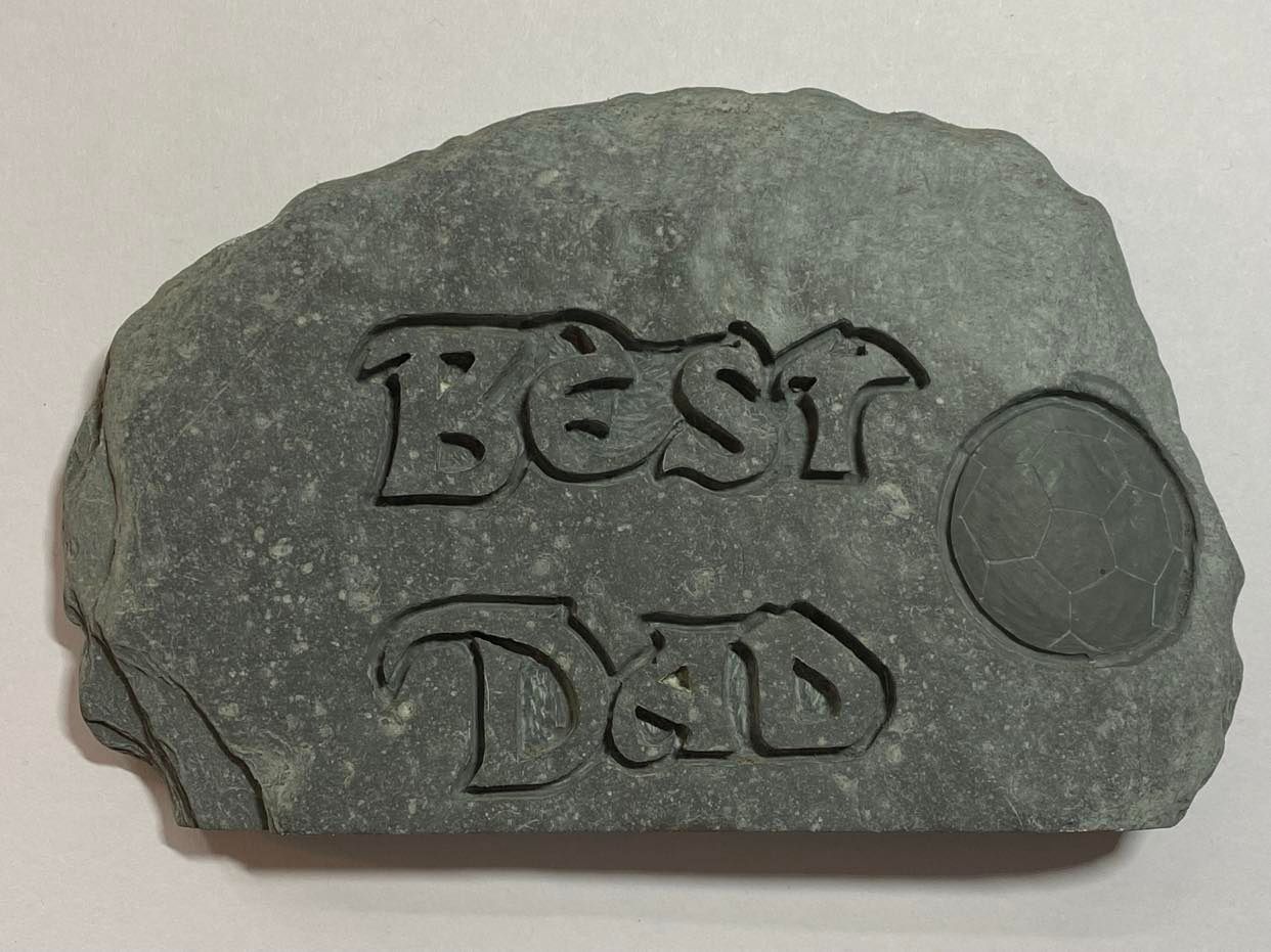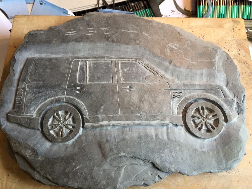 Cut and engraved in a Devonian Mudstone, cut to stand.